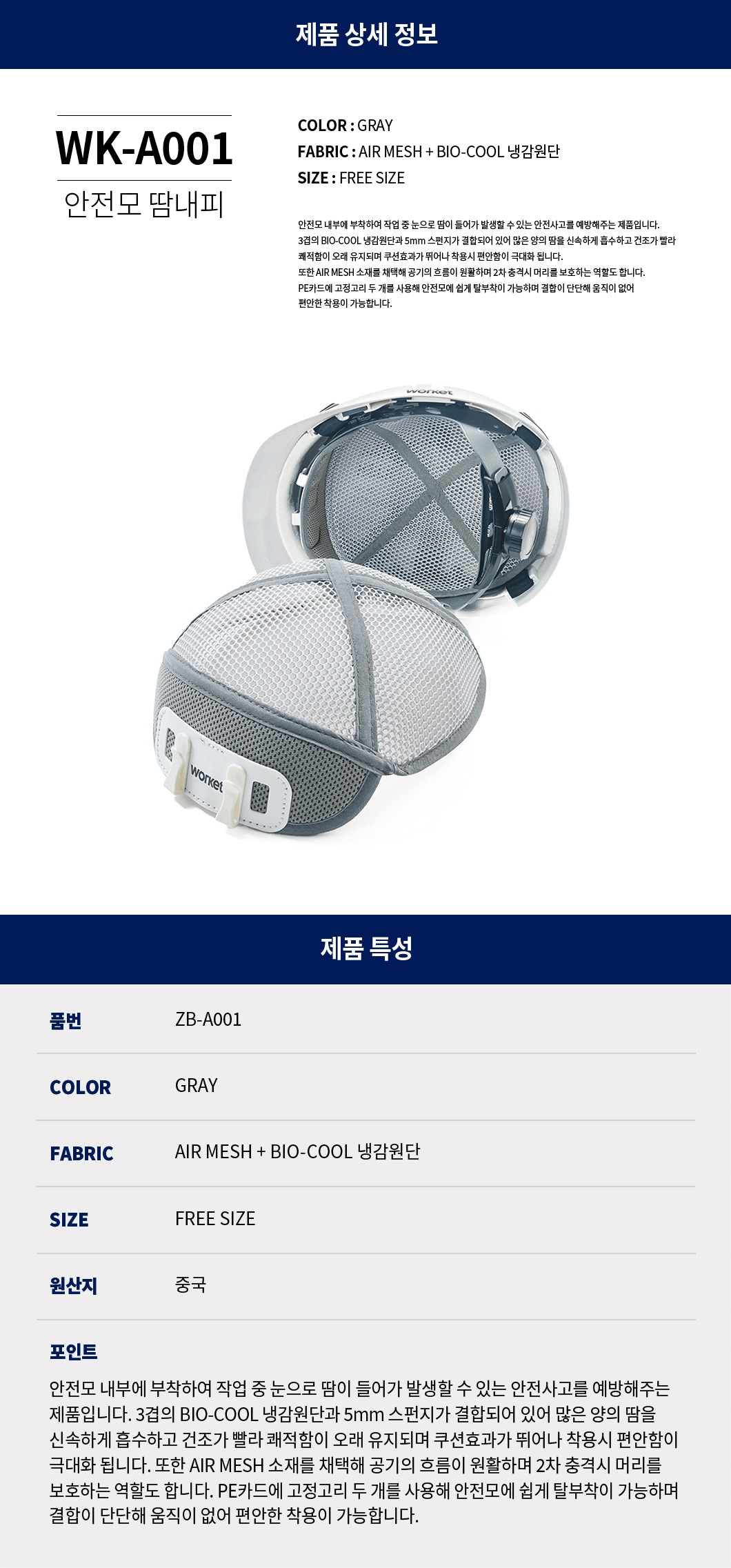 안전모 내부에 부착하여 작업 중 눈으로 땀이 들어가 발생할 수 있는 안전사고를 예방해주는 제품입니다.