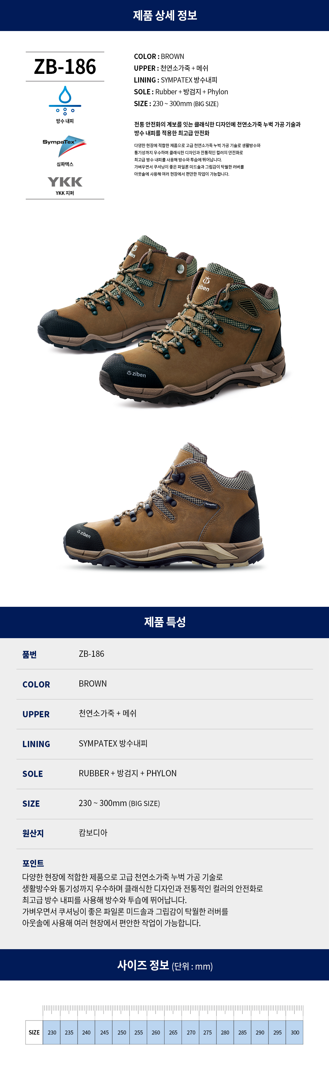 클래식한 디자인과 전통적인 컬러의 안전화로 최고급 방수 내피를 사용해 방수와 투습에 뛰어납니다.