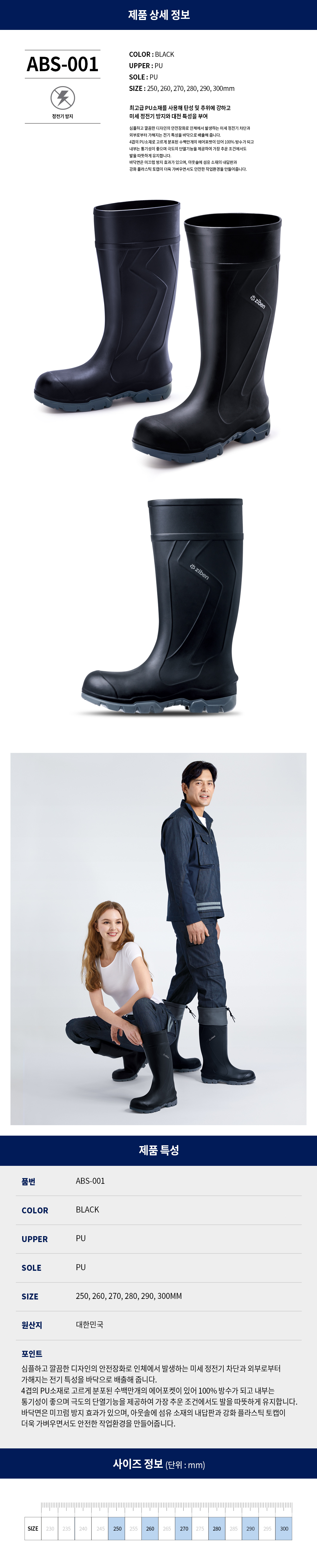 최고급 PU소재를 사용해 탄성 및 추위에 강하고 미세 정전기 방지와 대전 특성이 있는 안전장화