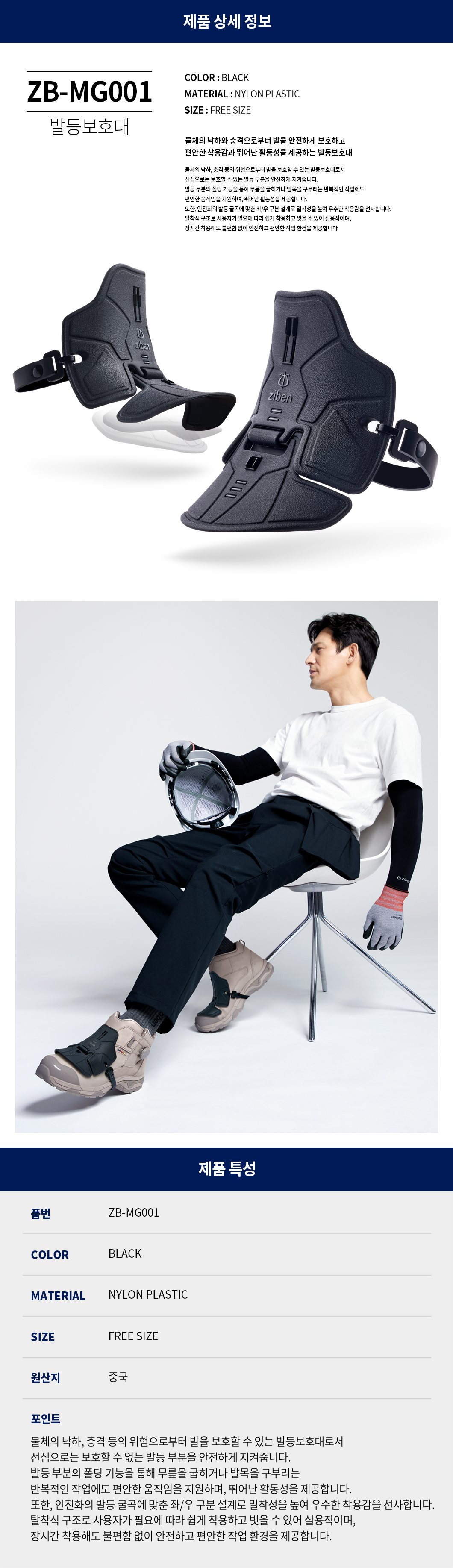 물체의 낙하와 충격으로부터 발을 안전하게 보호하고 편안한 착용감과 뛰어난 활동성을 제공하는 발등보호대